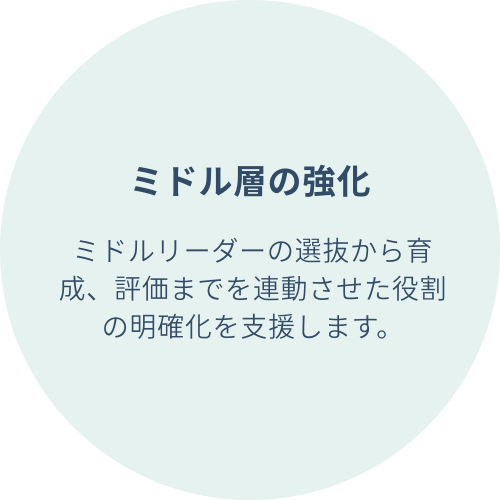 ミドルリーダーの選抜から育成、評価までを連動させた役割の明確化を支援します。